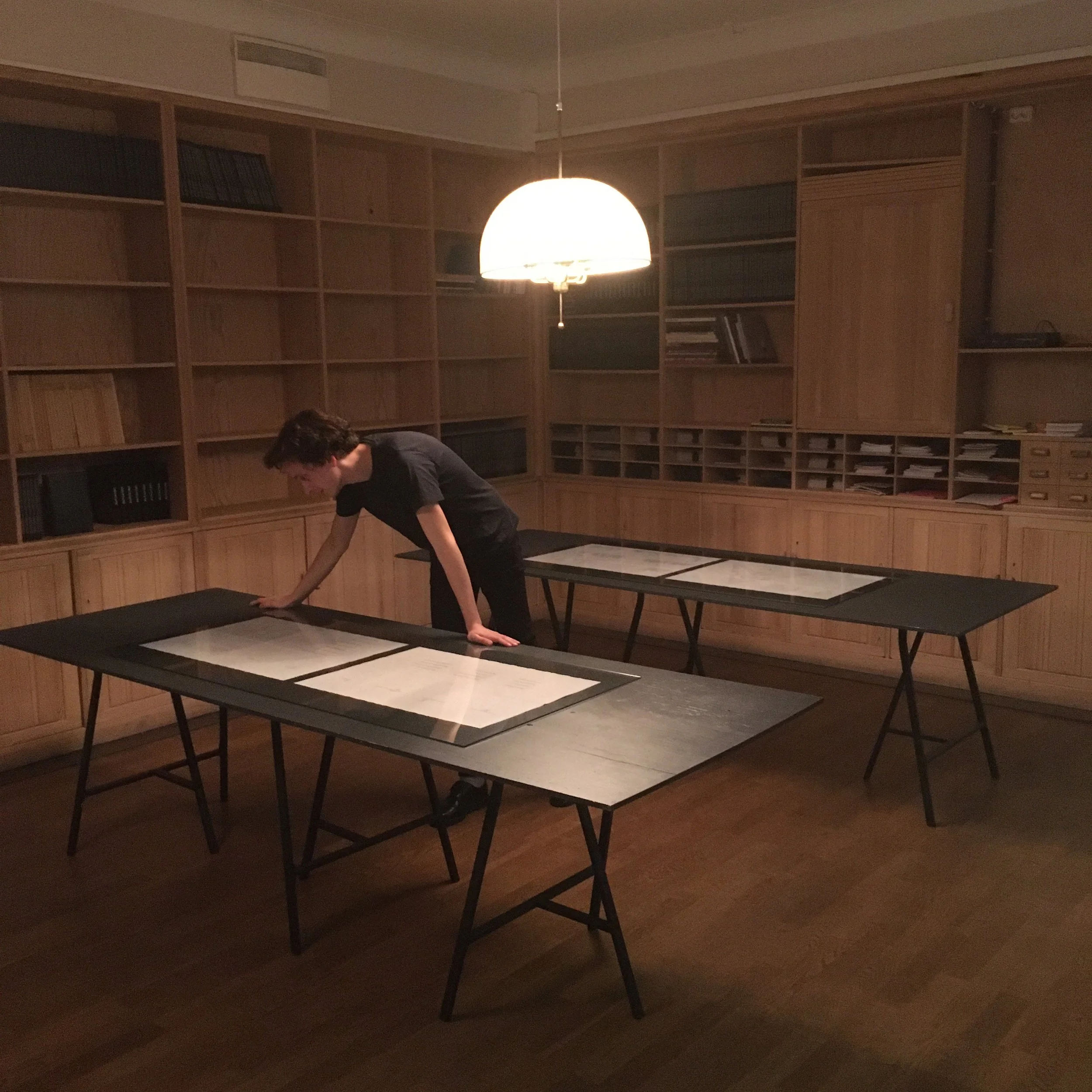 In October 2021, we organized an evening of readings at Marabouparken konsthall in Stockholm, celebrating the release of no. 40: Ark. In connection to the programme, we also exhibited the publication in the gallery’s library – an installation that was open for public viewing for five days following the release. We exhibited the unfolded print sheets in vitrine tables – displaying each of the publication’s four sides. The tables were placed so that one could move freely around them, viewing the publication from various angles and perspectives: reading upside down, going back and forth, coming close or taking a step back. To present the publication in this way not only challenged the differentiation between artwork and book, but also emphasized its spatial and temporal logic. The exhibited book object further extended the issue’s exploration of the spatial units of the book, and the uncovering of ways and directions of reading.