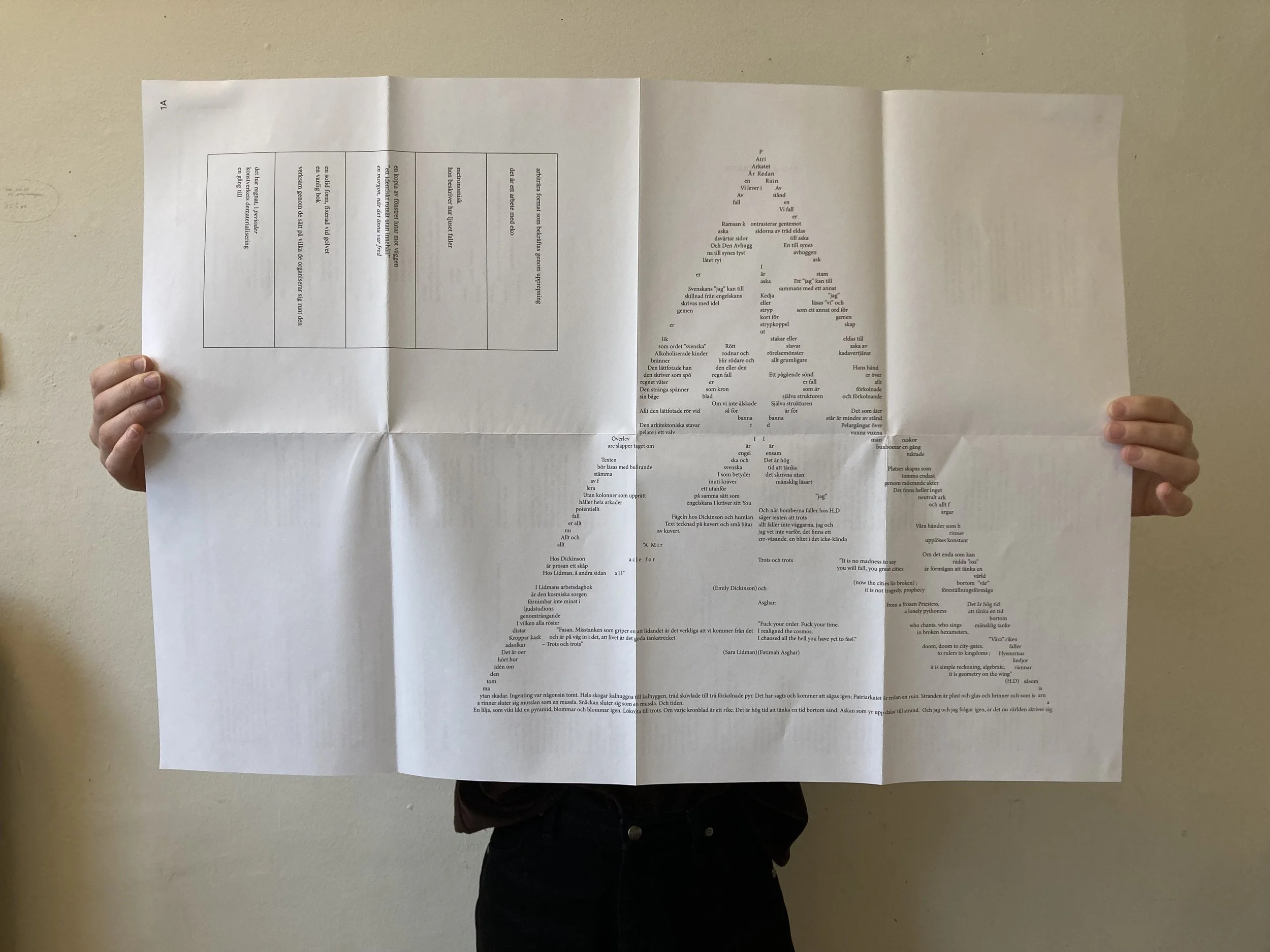 Treating this wide surface as a format reminded us of the unfolding of a map. But in this case the folds themselves represented spaces or units – and we invited poets to write for specific places within this architecture.