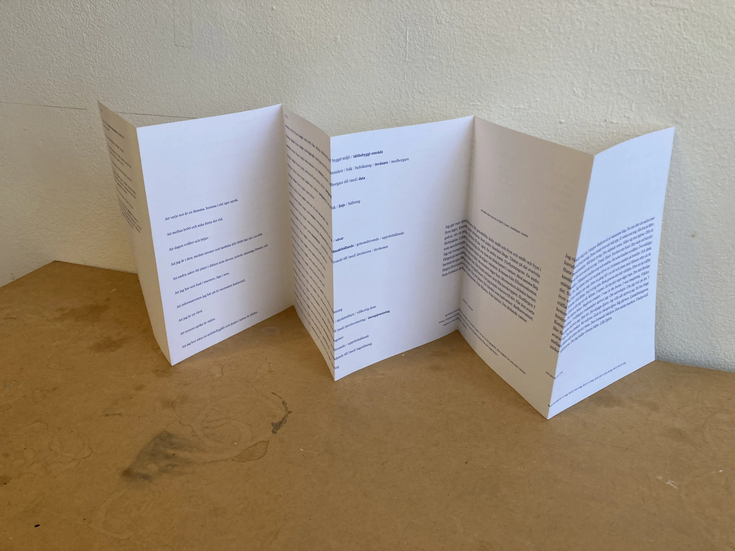 A bit like a möbius strip, the leporello issue does not have a defined in- or outside. Instead, one may look upon it as if it forms one continuous looping page. There is no cover, no spine and no binding. The unfolding and collapsable book object replaces the binary topology of the page spread with horizontal sequences. The sequencing in turn stipulates its own temporality, different from the one of an “ordinary” book. This form further invites the reader to manipulate the object, to try different ways of folding and reading, thus mapping out their own paths.