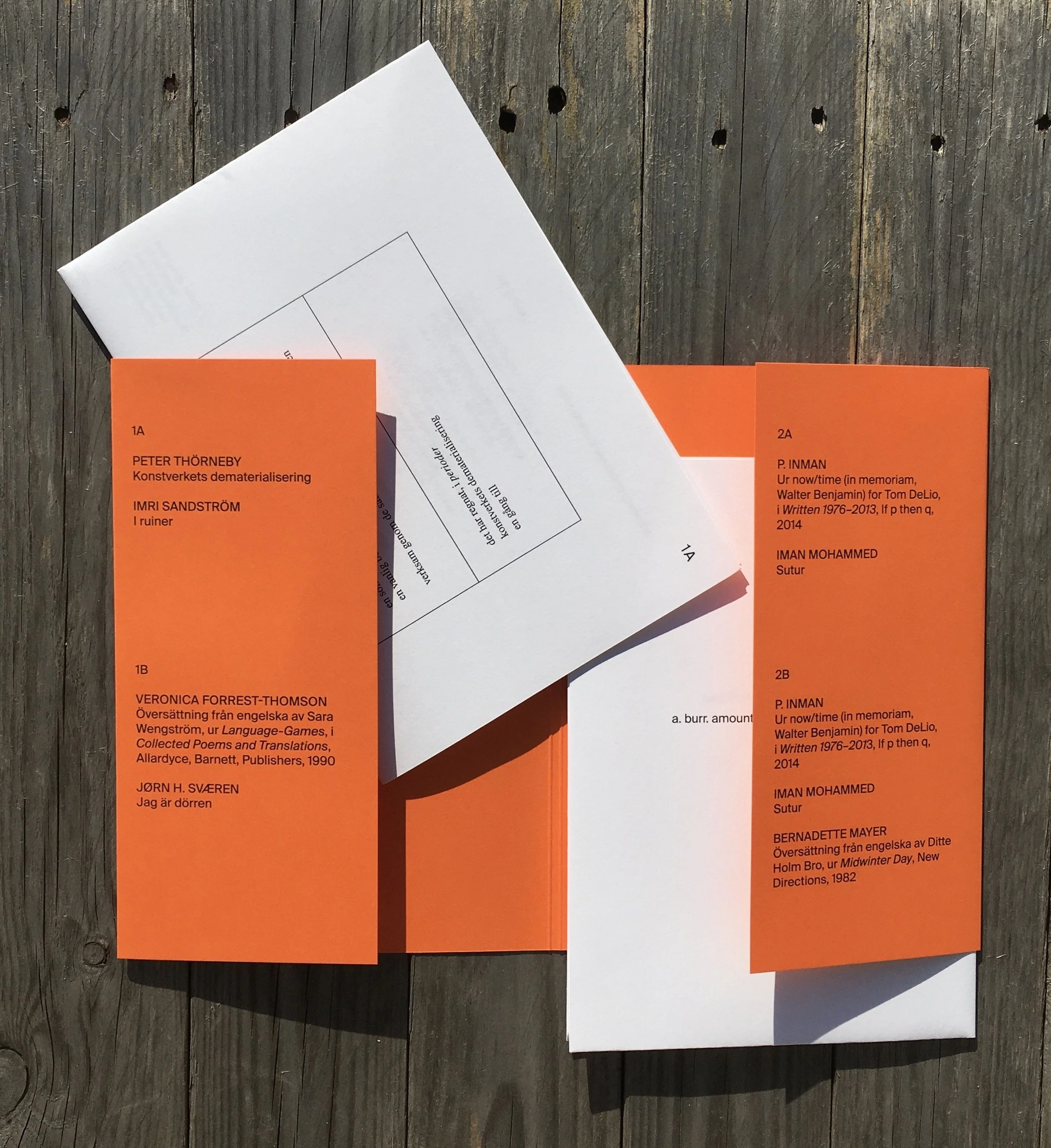In contrast to the horizontality of the leporello, Tydningen no. 40: Ark (Print Sheet) consists of two foldable print sheets, placed in a dust jacket. We got the idea of this format when we received an uncut proof of a previous issue from the printers; as we began the act of unfolding and folding, twisting and turning, we realized the potential for a future issue.